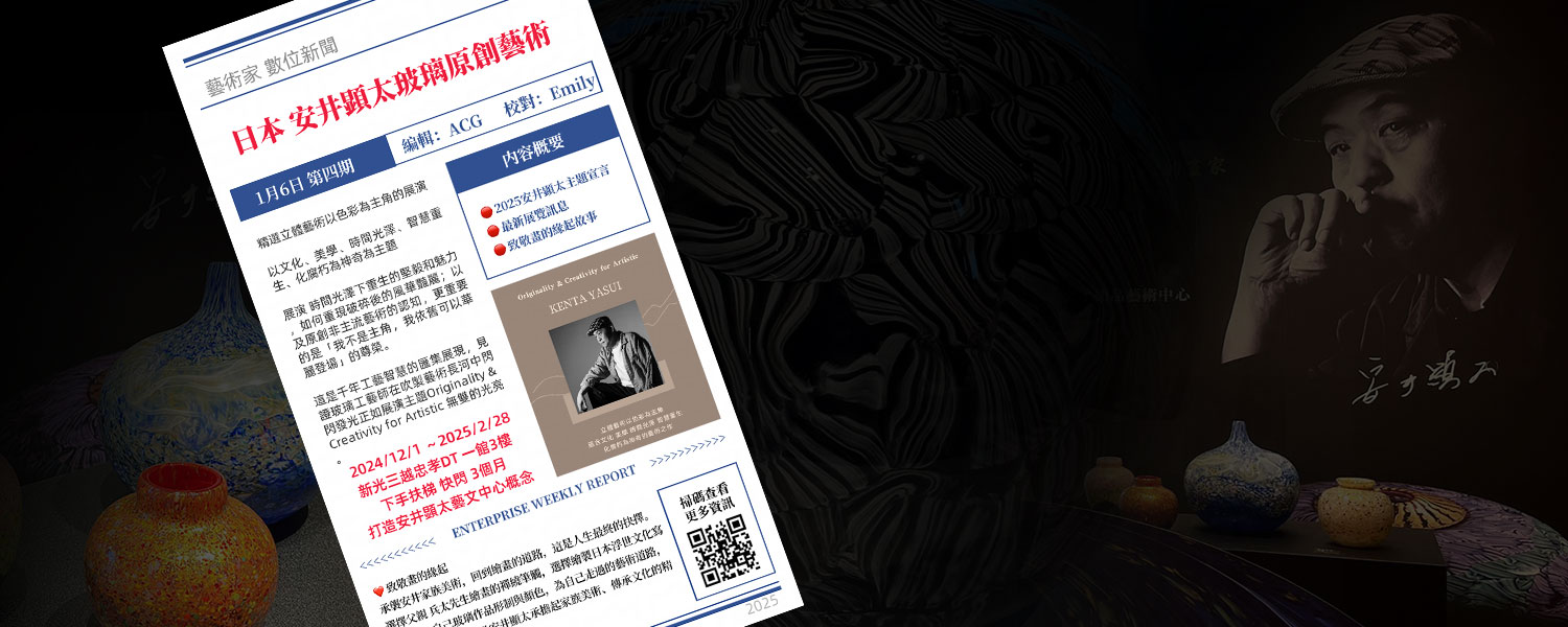 本協會顧問 安井顕太大師,創作示範。吹製玻璃Blowing Glass的技法最豐富、技術最困難,同時吹製玻璃涵蓋,機能的實用性、造形的觀賞性、材料的可塑性,如果沒有正規的教育課程規劃,是無法完整學習與精進。